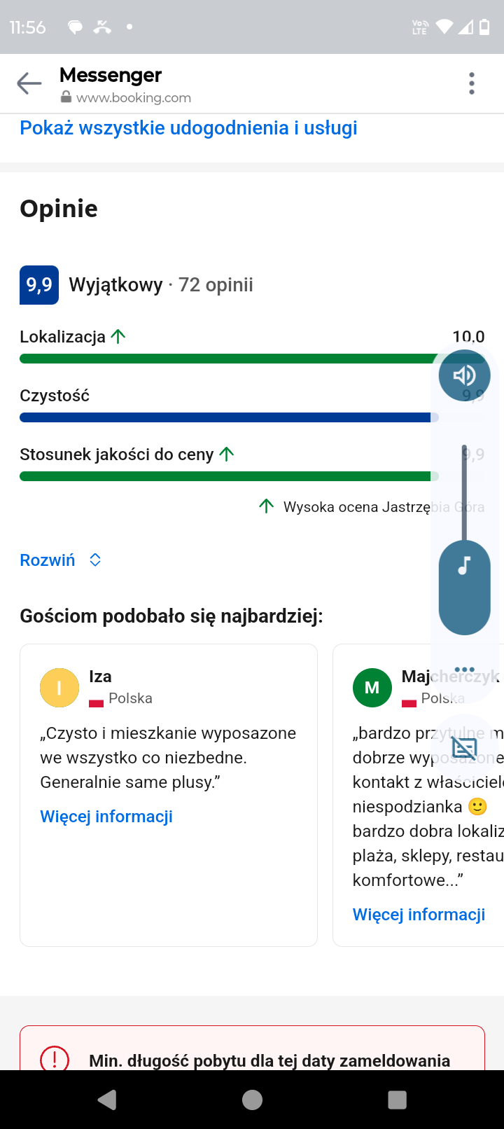 Możliwość odstąpienia strony na booking ze średnią ocen 9,9 / 70 opinii
