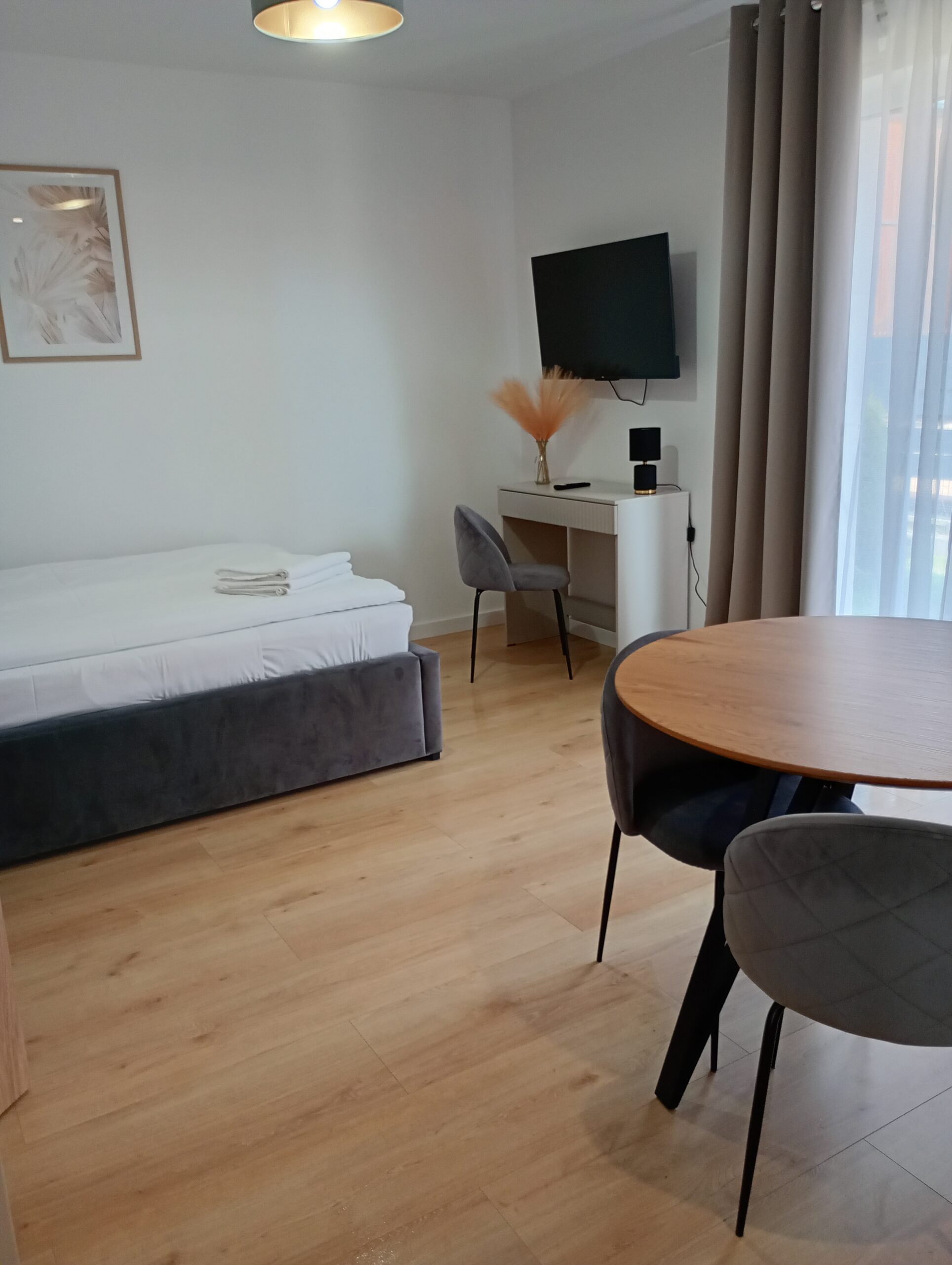 - dwa pokoje: salon z aneksem kuchennym, sypialnia, łazienka z kabiną prysznicową